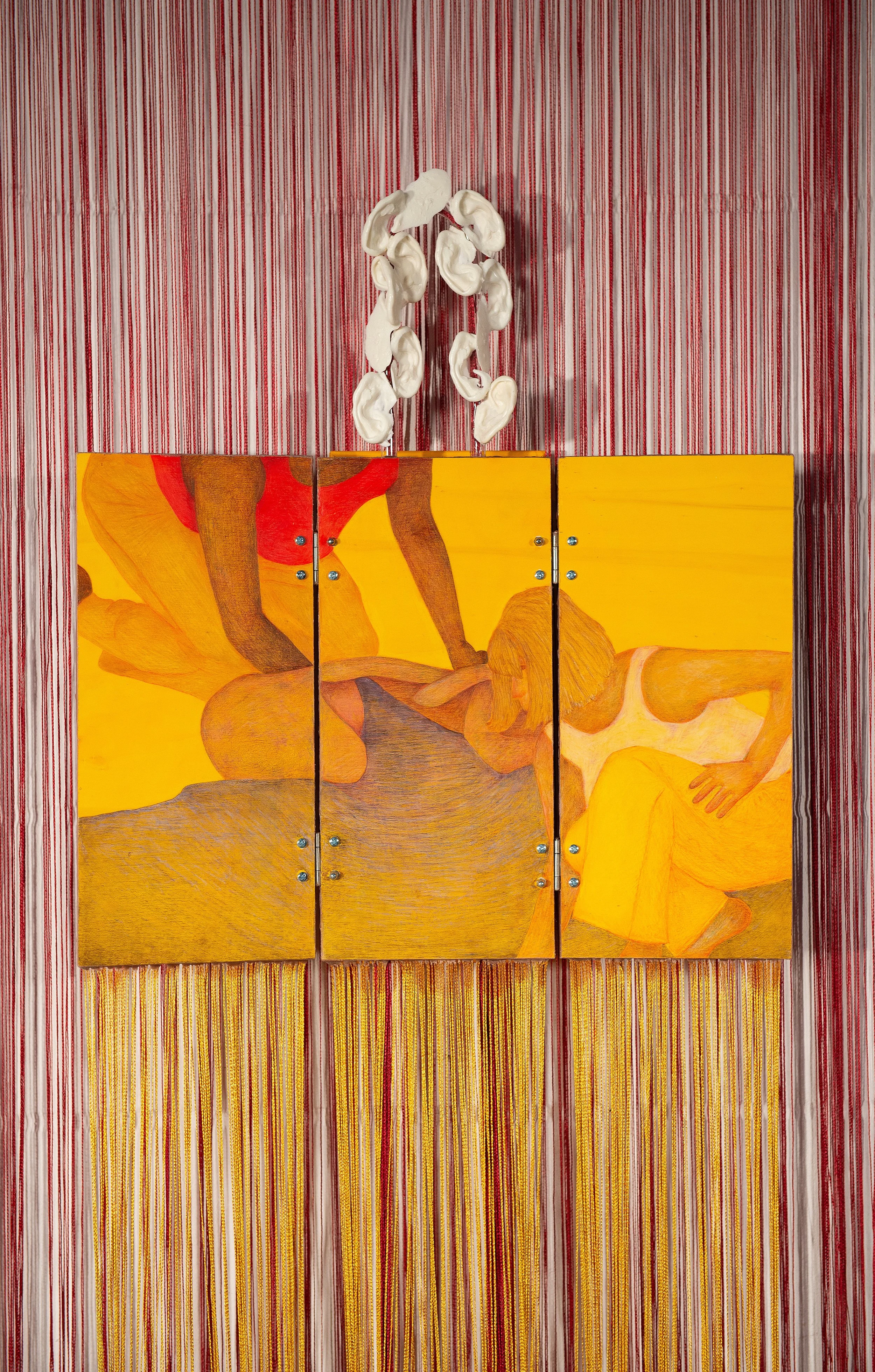 Above the middle panel drapes an arc of cast ears, and within the round glass tube run the same red strings that hang behind the triptych. Upon closer examination, these red threads can also be found woven into the golden strands that spill from the triptych. On the floor, the red and gold entangle.