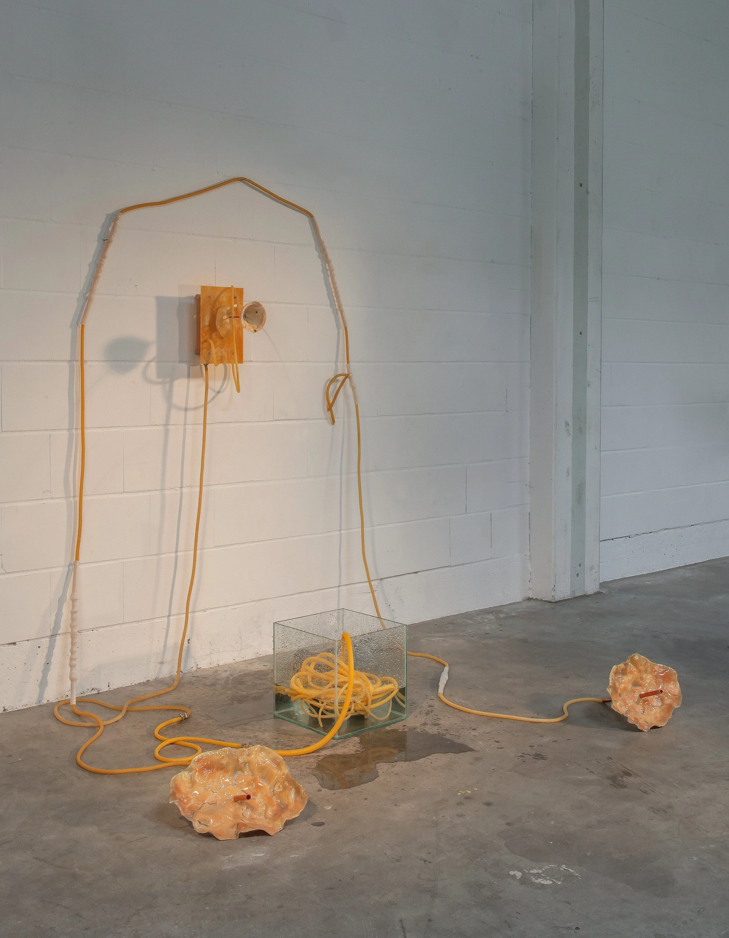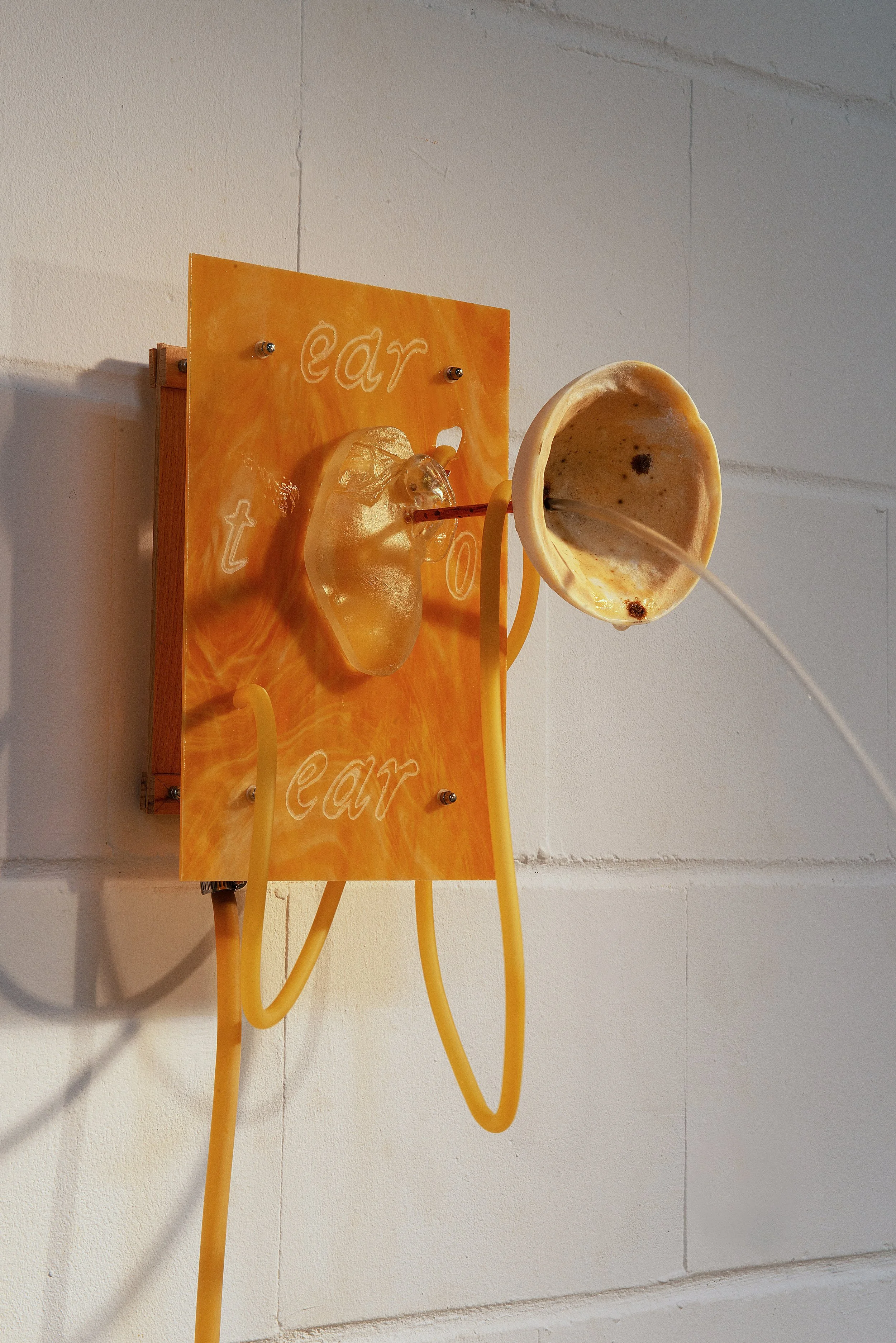 At the centre of the installation is a fountain made through various glass techniques. A glass cast of the artist’s ear leads to a pâte-de-verre funnel, surrounded by the words ‘ear to ear’ engraved into a sheet of cathedral glass. Water flows through the ear and out of the funnel into a pool of entangled rubber tubes. Once washed through the entangled chaos, the water returns to the ear.