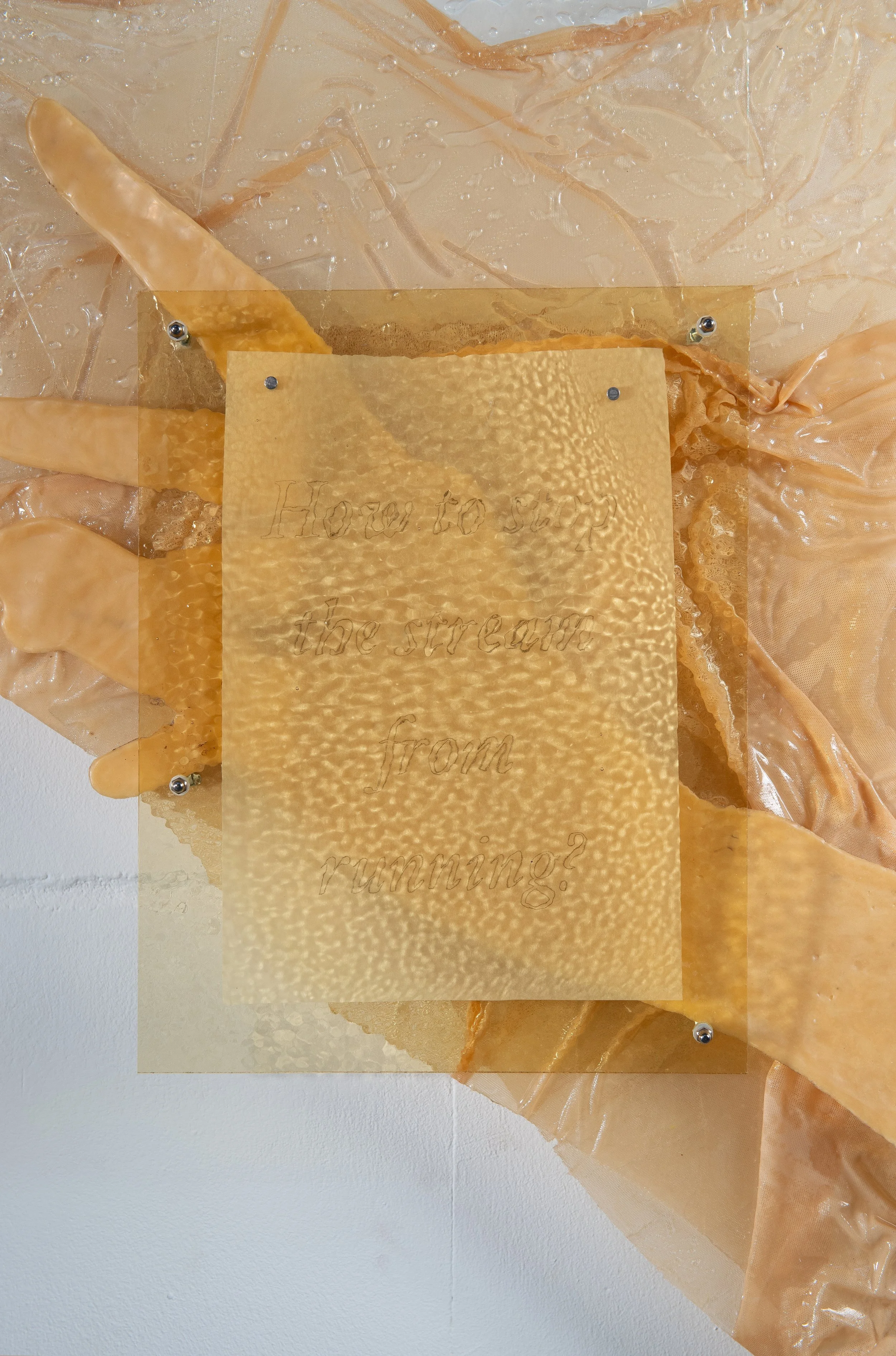 The work centres on a broken sheet of glass, its fragments held together by a translucent fabric that seems to suspend them mid-current. The surfaces appear wet, as though they are truly resting in a river’s flow. In front of them, a sheet of cathedral glass casts a shifting, watery shadow across a piece of tracing paper. Written on it are the words: ‘how to stop the stream from running?’