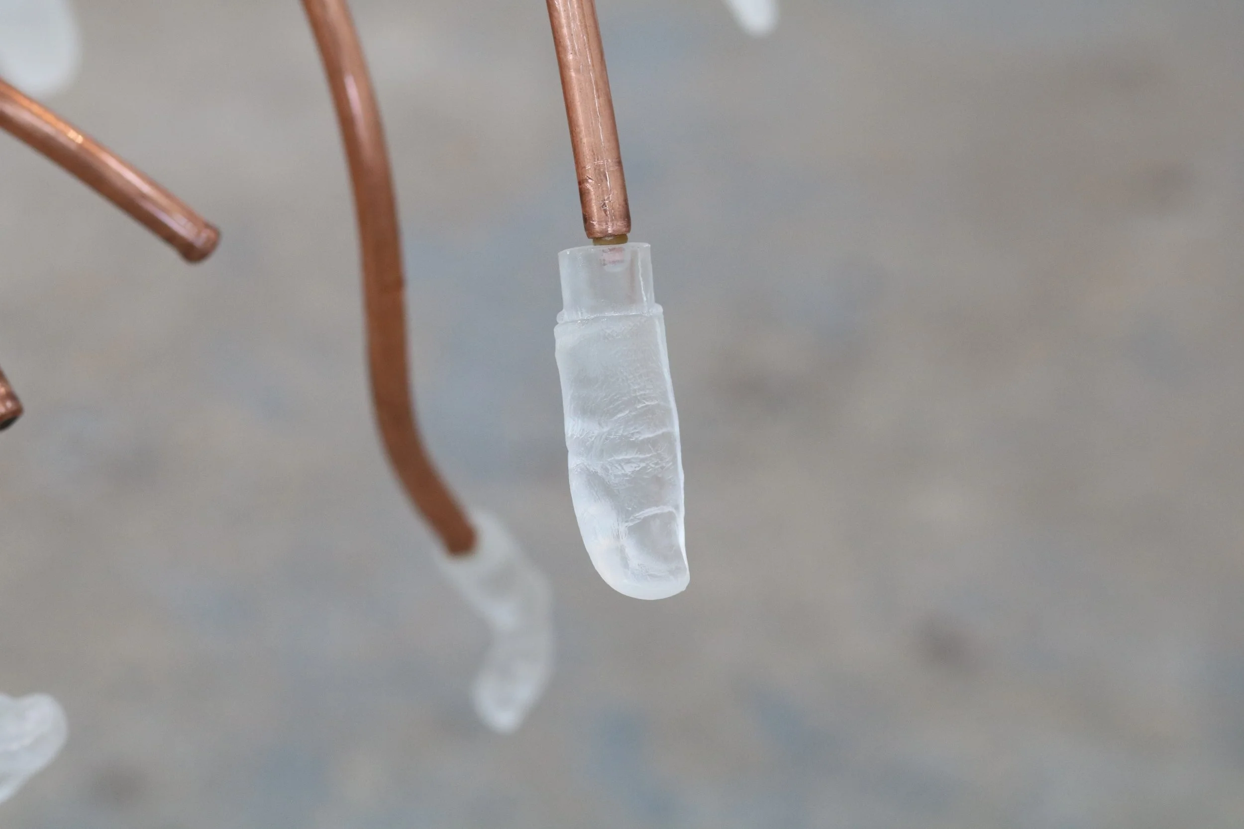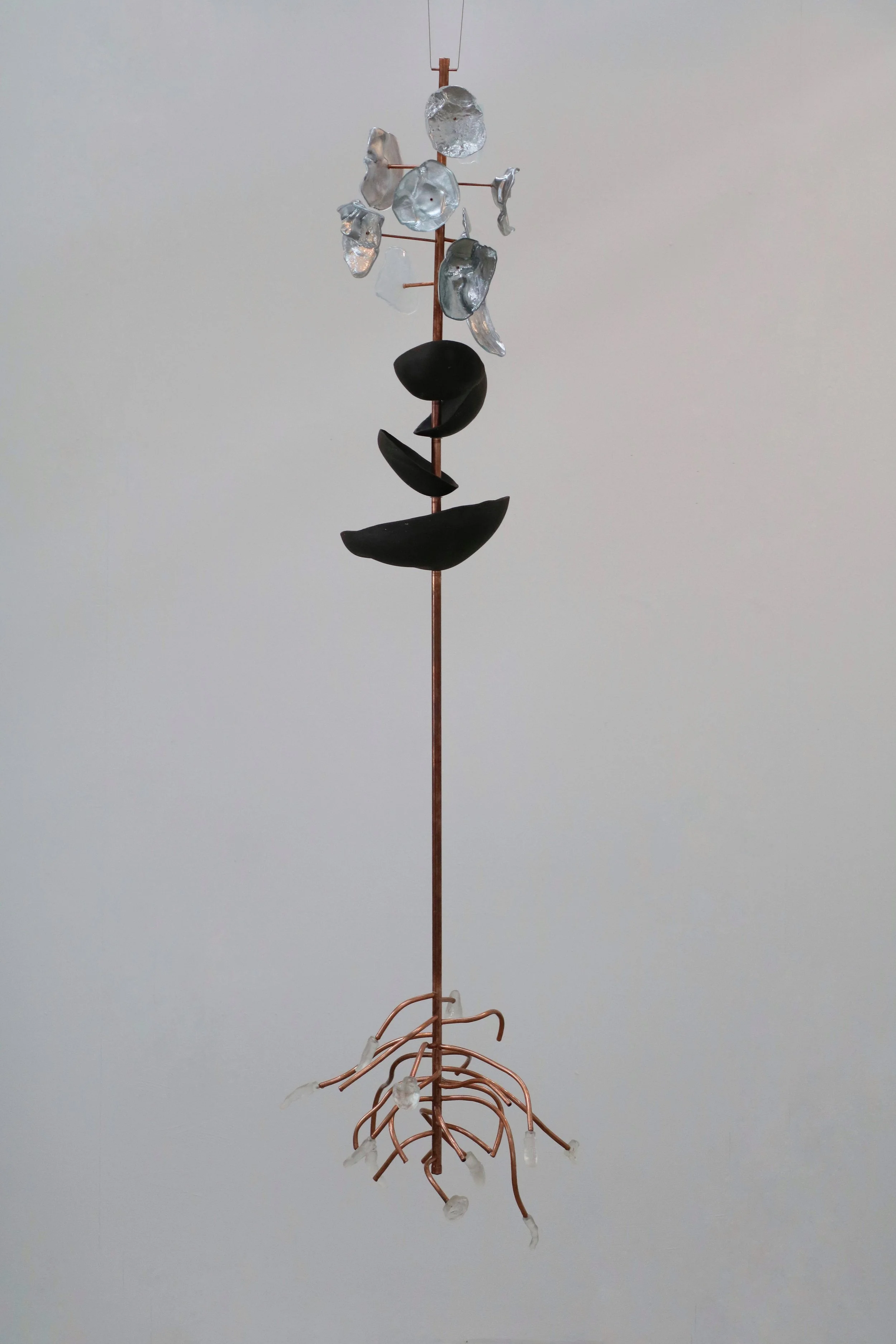 ‘Porous Body’ (2024) is a sculptural work that results from the artist's ongoing encounter, research, and dialogue with the human form as a receiver, sharer, and gatherer of information. Every living being, whether human or non-human, exists in this world both as an individual microorganism and as a component of various macro-organisms. These macro-organisms range from the entire human race inhabiting our planet to smaller communities like workplaces or families. ‘Porous Body’ thereby explores different form- and material-aspects of the human experience. Antennas, cast in the shape of sensory organs, reach like roots towards the soil. Glass and mirror funnels open on all sides, collecting information like branches. The middle, the trunk, the gut of the sculpture, consists of earth-made vessel shapes; all connected by hollow veins of soft copper.